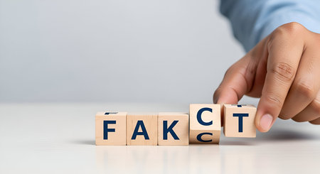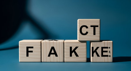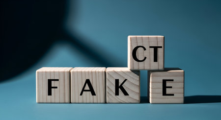 Wooden blocks with letters spelling out the words FAKE and FACT are arranged on a blue surface. The word FAKE is on four blocks in a row, and the word FACT is on three blocks stacked in a pyramid shape. A shadow is cast across the left side of the image.