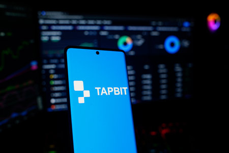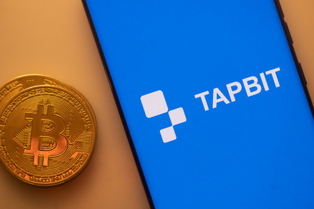 Dhaka, Bangladesh 22 September 2025:A Bitcoin and Tapbit logo on a blue screen representing cryptocurrency