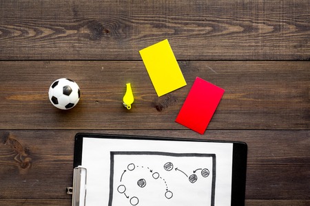 Sport judging concept. Soccer referee. Tactic plan for game, football ball, red and yellow cards, whistle on wooden background top view.