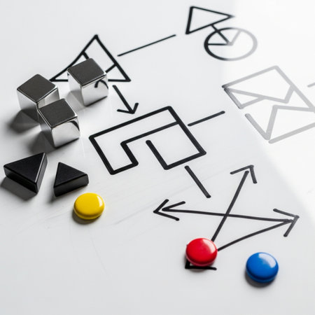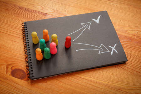 Strategic arrangement of colorful game pawns on a blackboard with flowchart like chalk lines