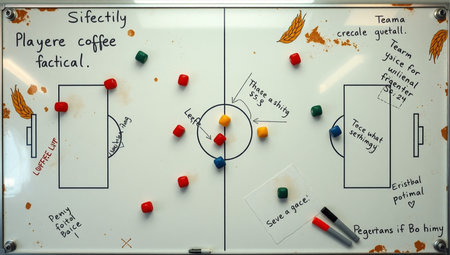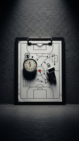 A vertical composition of coaching tools. A clipboard with a complex play diagram is centered, flank