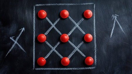 This image showcases a creative board game design featuring red checkers on a chalkboard background, emphasizing strategic line arrangements and competition.