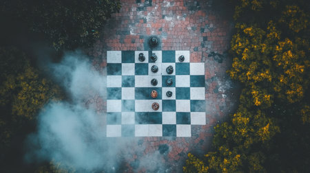 Aerial view of a strategic chess match on a large outdoor board, enveloped in mist and framed by vibrant greenery, offering a serene yet competitive atmosphere.