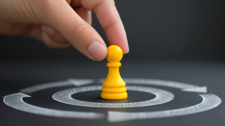 A hand delicately moves a yellow chess pawn within a circular target design, symbolizing strategic decision-making in business or personal growth.