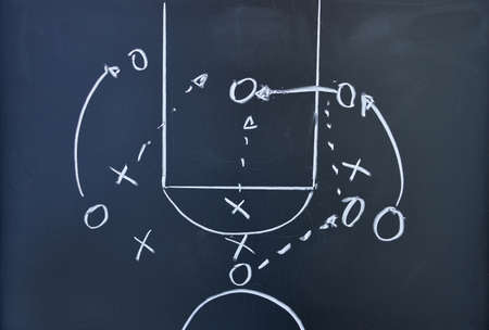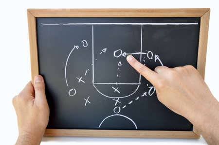 coach indicating with the finger the tactic of the meeting on the blackboard with white background