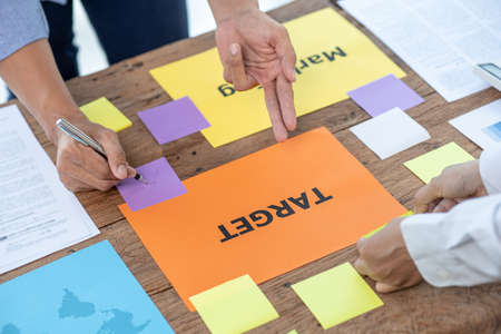 Close up of developer team using mind map to brainstorm idea. Top view of skilled group of business people working together writing marketing strategy by using markers and sticky notes. Symposium.