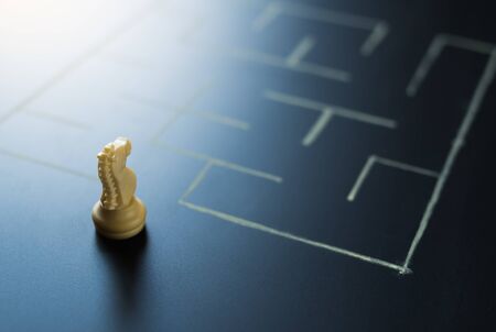 Conceptual photo of business strategy - a line of horse chess pieces in the middle of an army and jigsaw puzzles