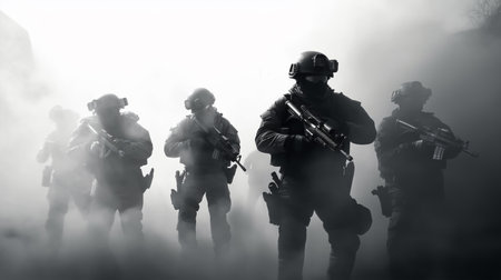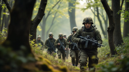 Armed military personnel traversing a dense woodland environment in formation. Soldiers equipped with tactical gear, helmets and assault rifles move cautiously through fog-shrouded forest on a training exercise or mission.