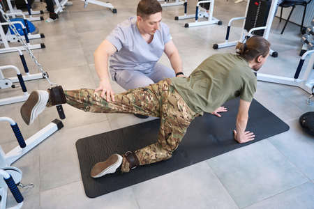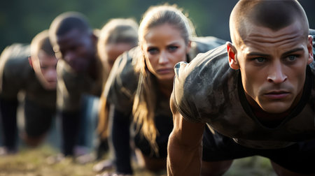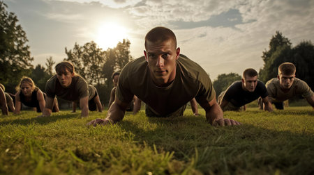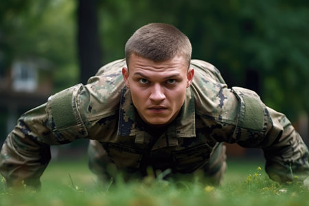 cropped shot of a young soldier doing pushups outdoors, created with generative ai