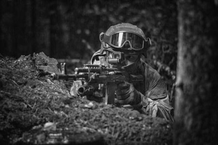 Portrait of a soldier in the forest. He sits in cover and prepares to shoot. Border Protection Concept. Mixed media