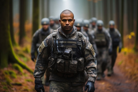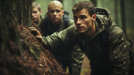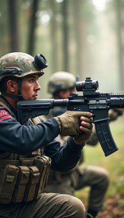 A focused male soldier wearing tactical gear and a helmet in a forest, ready for a military mission or operation.