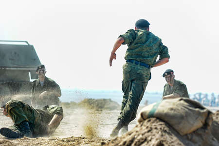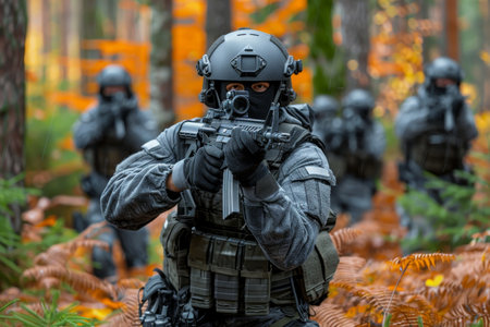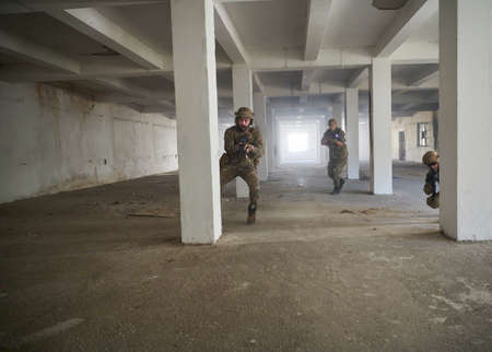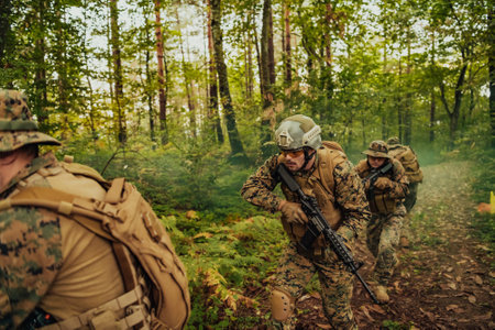 A group of modern warfare soldiers is fighting a war in dangerous remote forest areas. A group of soldiers is fighting on the enemy line with modern weapons. The concept of warfare and military conflicts