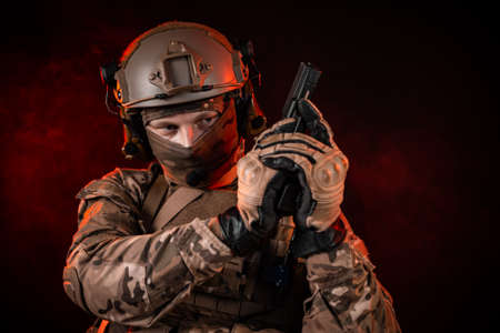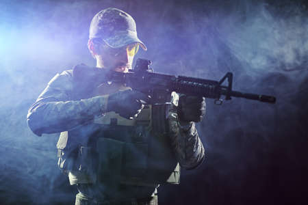 A courageous soldier in Protective Combat Uniform aims with assault rifle standing in the darkness shrouded in smoke. War and military concept.