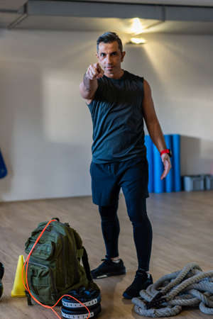 Gym instructor showing muscles. Motivated boot camp instructor stands with gym equipment in gym hall. Dumbbells, rope, sandbag on wooden floor. Portrait for gym concept.
