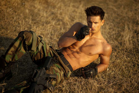 Muscular, sexy, armed soldier wearing camouflage pants and rests on the grass on the military tank background.Horizontal view.