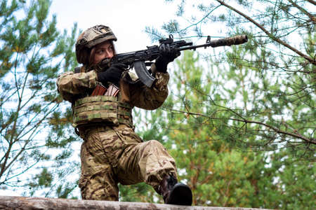 Portrait of a young girl in a military camouflage uniform holding a weapon against the background of a forest. A woman in a tactical helmet and a bulletproof vest aims an automatic rifle.