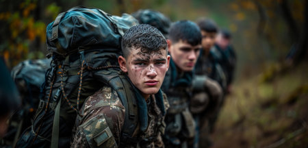 military cadets participating in a grueling endurance march, their heavy packs and weary expressions testament to the physical and mental challenges AI generated