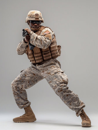 Portrait of an Army soldier in Protective Combat Uniform standing on alert with a gun. Grey studio background. Military concept. Studio shot.