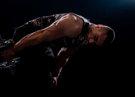 Handsome power athletic man in training pumping up muscles with dumbbells