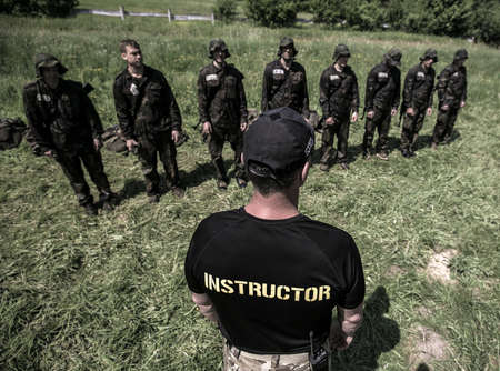 tactical instructor with stop watch examining multiracial soldiers during obstacle run on range