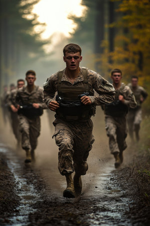 Young soldier running through open field with squad behind, gripping rifle, showing determination and physical endurance during combat training exercise.