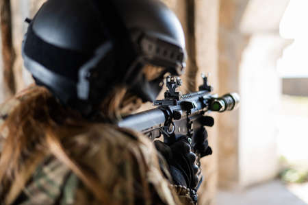 Shallow depth of field (selective focus) details with a special forces soldier aiming his weapon.