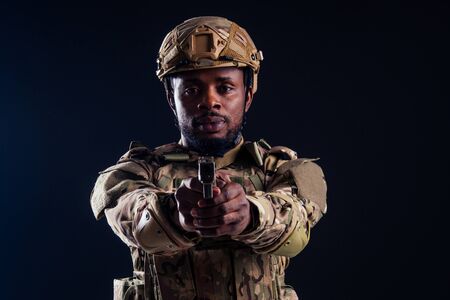 Army soldier in Combat Uniforms with an assault rifle and combat helmet night mission dark background. Blue and purple gel light effect.
