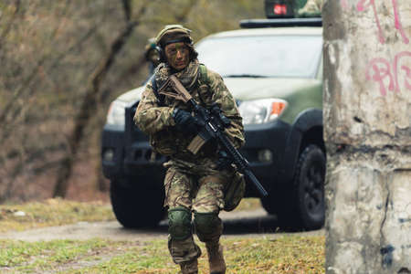 A bearded soldier in uniform of special forces in a dangerous military action in a dangerous enemy area. Selective focus