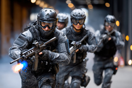 A tactical team of military personnel advances swiftly through a city street, practicing maneuvers with weapons.