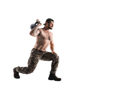 Muscular athlete bodybuilder man in camouflage pants with a naked torso workout with kettlebell on a white background. Isolate