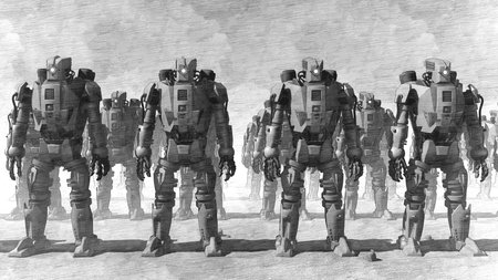 A group of advanced robotic soldiers stands in formation, equipped with sophisticated firearms and armor.
