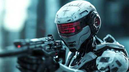 A futuristic illustration of a robot with artificial intelligence. The robot is sleek and advanced, with glowing eyes and a powerful presence