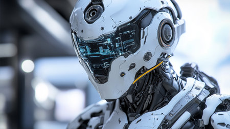 Close-up of futuristic robot head on blurred background. Selective focus.