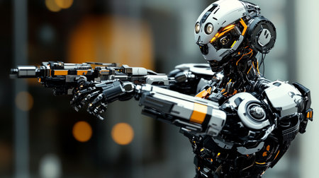 A modern robot with a shiny black and orange exterior stands confidently, highlighting its high-tech design elements.