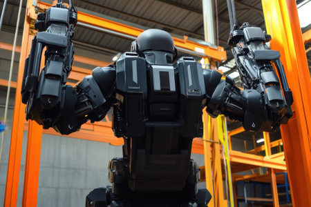A large robotic device stands in a warehouse, showing advanced mechanical arms designed for heavy lifting.