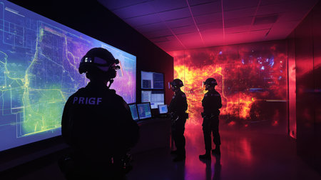 Holographic police officers work to diffuse a tense hostage situation using simulated negotiation techniques and crisis management strategies