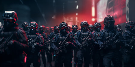Platoon of futuristic soldiers in tactical gear with red visors standing ready in a misty, illuminated environment