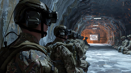 A group of soldiers wearing virtual reality headsets are sitting in a row in a simulated underground tunnel environment. The soldiers are all wearing camouflage uniforms and are facing forward. There is a screen at the end of the tunnel that appears to be displaying a virtual reality scene.