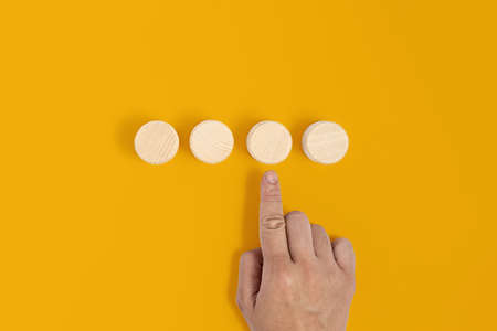 The circular wooden block is placed on a yellow background with a hand pointing at the wooden block. Wood block concept, banner with copy space for text, poster, mockup template.