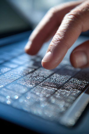 A close-up view of a finger gently gliding across braille cells on a tactile display, emphasizing the significance of accessible technology for individuals with visual impairments and promoting inclusivity