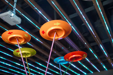 A collection of spinning yellow, blue, red pink plates . Fun with Spinning Plates .balancing a spinning plate.