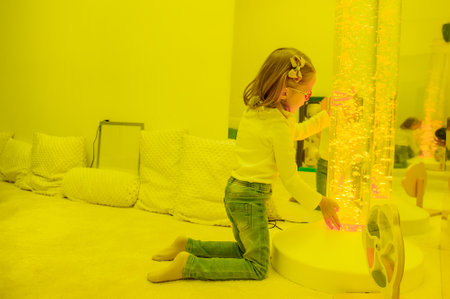 Child in sensory room, snoezelen, interacting with colored lights bubble tube lamp during therapy session. Child with cerebral palsy in occupational therapy.