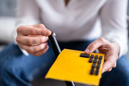 A hand-held twister game. twister on your fingers. a person's fingers on two colored circles.
