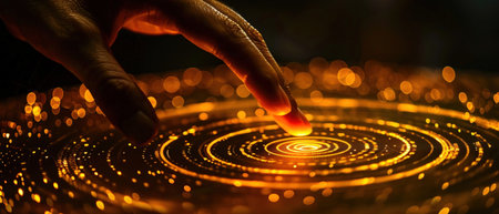 A human finger poised to touch a glowing digital interface with concentric circles, symbolizing modern technology and interactivity.
