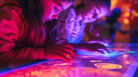 Children engaging with interactive exhibits in a museum, using touch screens and educational games, experiencing wonder and learning through play. AI generated