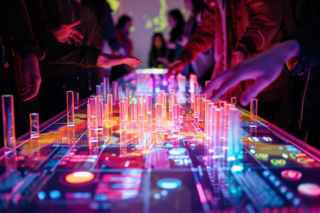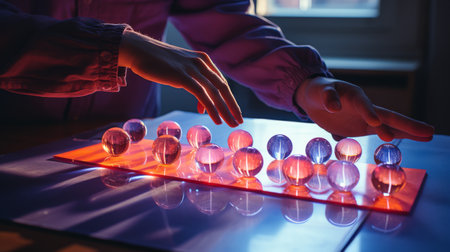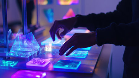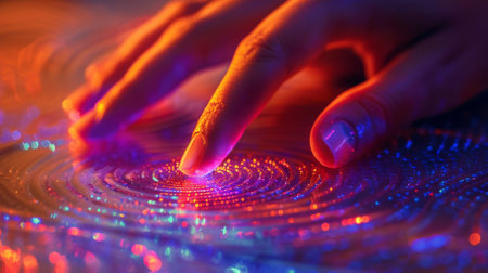 A close-up view of a hand gracefully touching a glittery surface illuminated by vibrant neon lights, creating a mesmerizing and futuristic atmosphere.