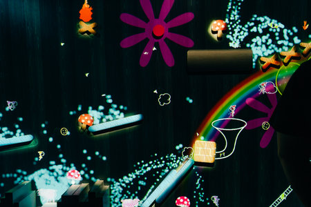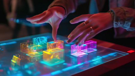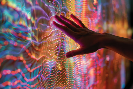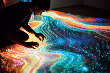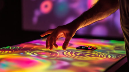 A hand interacts with a colorful projection surface, generating vibrant patterns and effects that highlight the blend of art and technology in an imaginative environment.