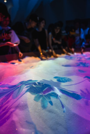 Interactive Sand Exhibit with Multicolored Floral Projections Indoors