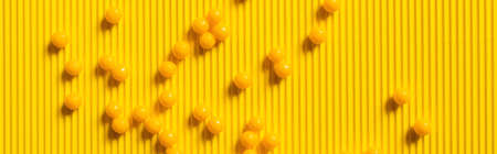 A close-up view of colorful, spherical objects arranged in a grid pattern on a wet, black surface