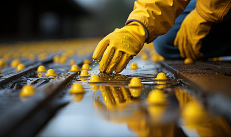 A person wearing yellow gloves is picking up bright yellow cones from the ground.